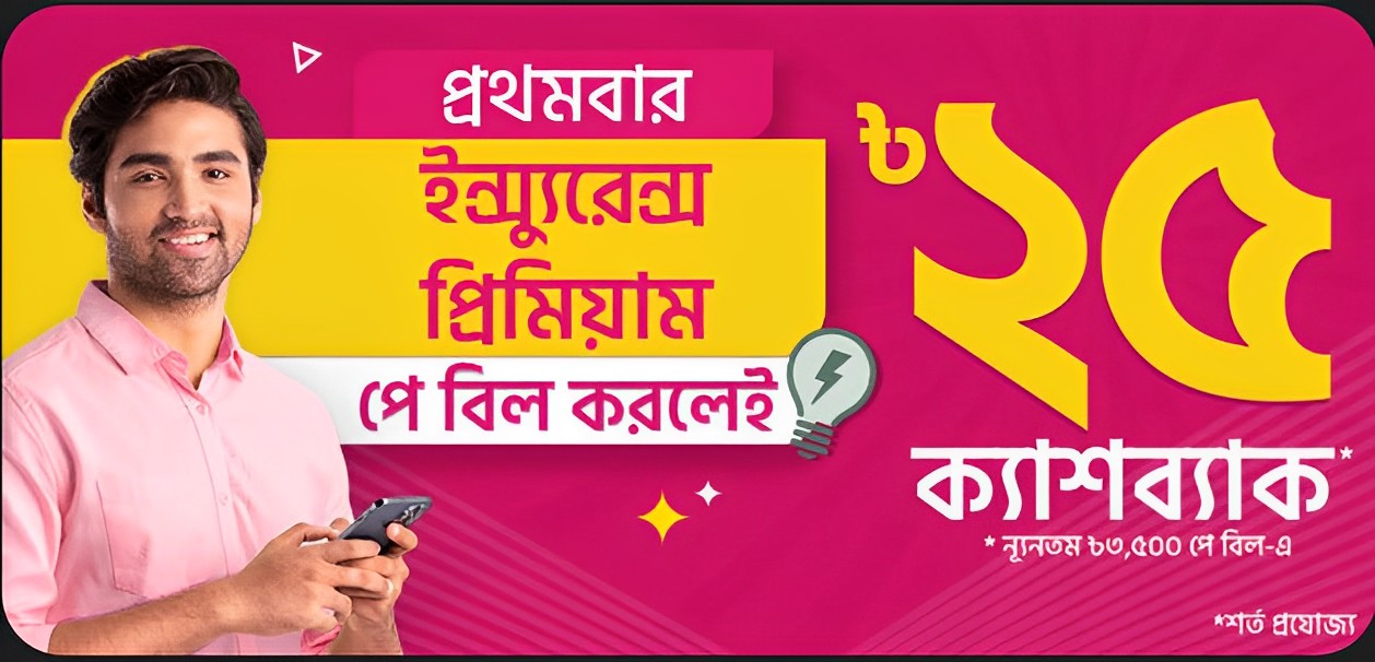 Misc বিকাশ থেকে ৩,৫০০ টাকা বা তার বেশি ইন্স্যুরেন্স প্রিমিয়াম পে বিল করলেই পাচ্ছেন ২৫ টাকা ক্যাশব্যাক! Policyholders can now avail Tk 25 cashback on Premium Payment of Tk 3,500 or more through bKash Paym 2023-06-24